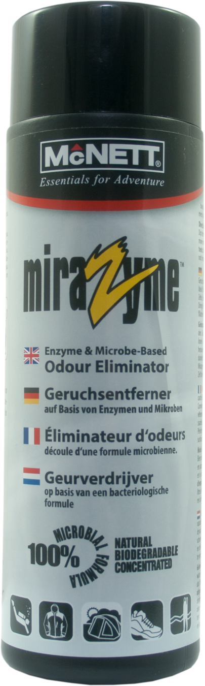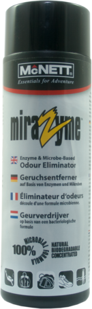 MiraZymeâ„¢ Odour Eliminator is a powerful blend of natural enzymes and microbes used to remove odours caused by mold, mildew and bacteria. McNett has identified, separated and reproduced a unique blend of 10 naturally occurring and highly adapted enzymes, microbes and other organic ingredients designed to identify and destroy odour.