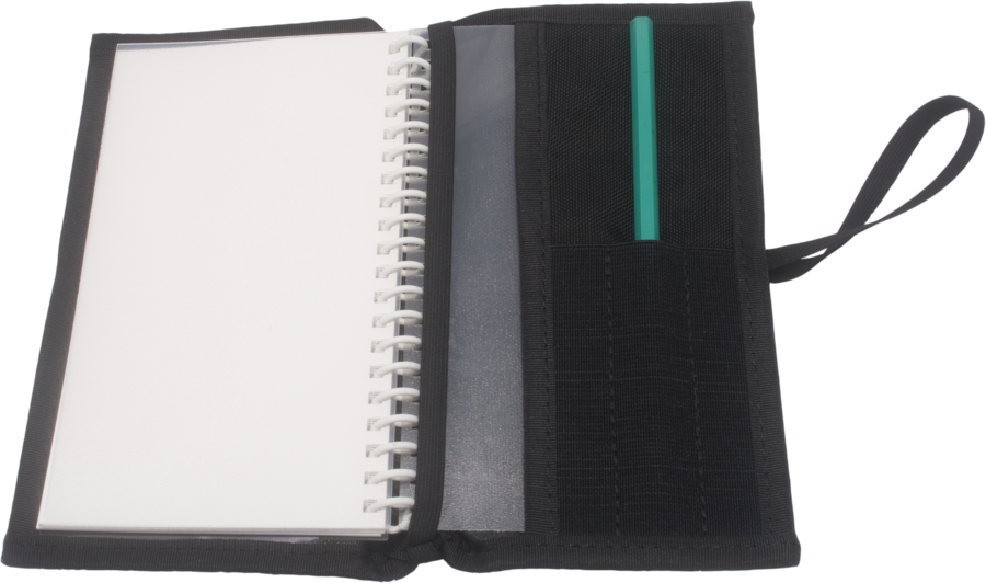 Cover is sewn from Cordura. It has pockets for pencils and compass and also an eye for hooking a double end snap.