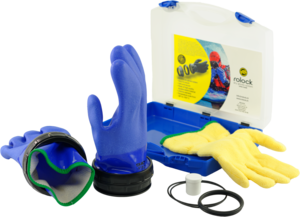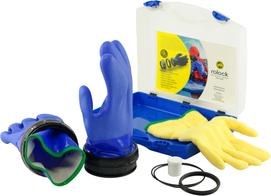 Pre-mounted complete Rolock system on blue gloves with seperated inner gloves, all O-rings and silicone care dose.